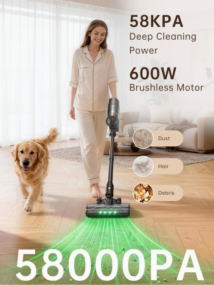 Motor de 600 W con succión ultra potente de 58 kPa: el R7F ofrece una resistencia de limpieza excepcional con su avanzado motor sin escobillas de 600 W, generando 58 kPa de succión ultra potente. Esto garantiza una limpieza profunda en alfombras, alfombras, pisos de madera dura y azulejos, lo que la convierte en una verdadera aspiradora de succión potente para hogares con mascotas, niños y desorden diario pesado.