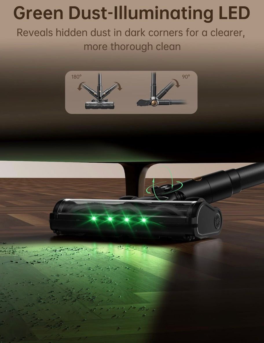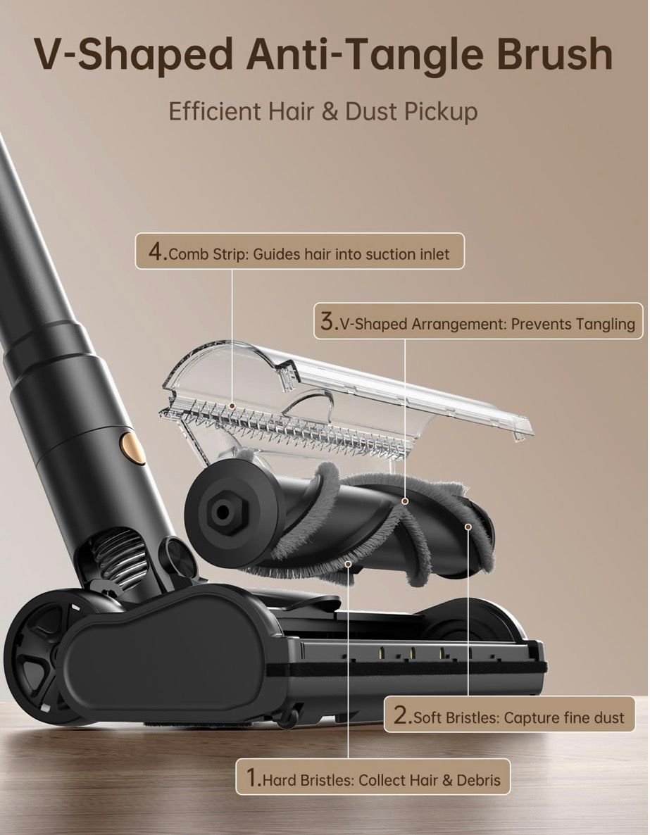 Cepillo en V flexible con iluminación LED de polvo verde: el cepillo en V giratorio mejorado cuenta con LED verdes de seguimiento de polvo que exponen la suciedad invisible a simple vista. Se desliza sin esfuerzo alrededor de muebles, paredes y esquinas estrechas, ofreciendo una limpieza más completa en cualquier tipo de piso, lo que la convierte en una aspiradora multisuperficie de alto rendimiento.