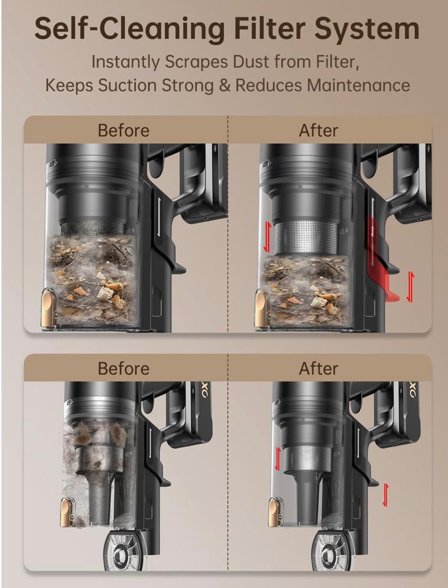 El sistema de filtro autolimpiante evita obstrucciones y mantiene la succión: el innovador sistema de filtro autolimpiante elimina automáticamente la acumulación de polvo del filtro de metal con una simple acción de tracción, ayudando a mantener un fuerte flujo de aire y succión. Esto reduce el mantenimiento y mejora el rendimiento a largo plazo, una actualización esencial para cualquier aspiradora de barra moderna.